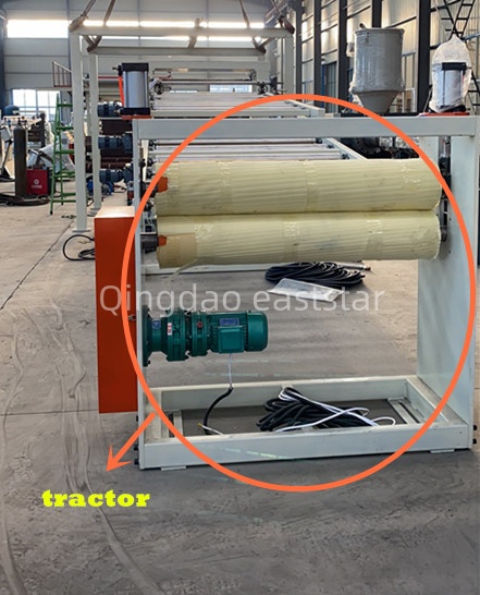 整條多層共擠生產(chǎn)線還包含兩臺液壓換網(wǎng)器、8米冷卻托架和牽引裁斷系統(tǒng)。換網(wǎng)器采用臺灣液壓元件,實現(xiàn)不停機換網(wǎng)。牽引機配備Φ240×2500mm丁腈膠輥,通過2.2KW電機驅(qū)動,實現(xiàn)與三輥的同步調(diào)速。ABS共擠板材設(shè)備的電控系統(tǒng)采用西門子S7系列PLC和觸摸屏,配合ABB變頻器,確保整線協(xié)調(diào)運行。