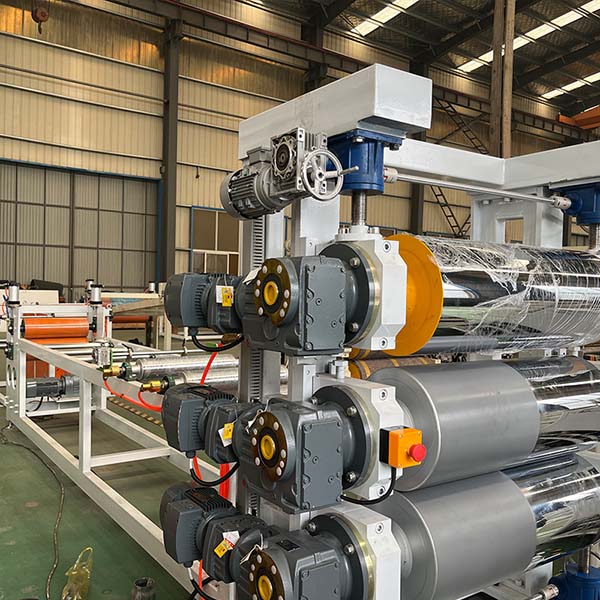 生產(chǎn)線的組成:?jiǎn)温輻U擠出機(jī),三輥壓光機(jī),冷卻托架帶自動(dòng)裁邊裝置,膠輥牽引機(jī),收卷機(jī),可根據(jù)客戶不同的要求生產(chǎn)不同規(guī)格的產(chǎn)品。不同表面的片材的,可生產(chǎn)光面,橘皮面,磨砂面。